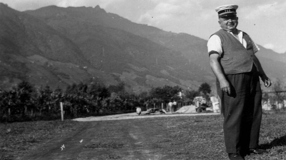 L’uomo e… un mondo a sé – Un aneddoto, per iniziare. Il capo, se è un vero capo, non si scompone davanti ai fatti, nemmeno se clamorosi; men che meno quando la cosa, a parer suo, si può risolvere con strumenti ordinari o straordinari, purché a portata di mano. Fu così che il capo, una volta rilevata la presenza dell’oggetto, provvide a recuperarlo, lo piazzò nel mezzo di un’area recintata ed a distanza dal consorzio degli uomini e delle bestie e solo ad operazioni ultimate fece uso del suo solido italiano ad alto coefficiente germanofono per contattare chi di dovere. Dita sul disco del telefono, numero conosciuto: “Polizia? Puonciorno, puonciorno, kwi Bussmann Alois. Appiamo appena trofato in laco uno bomba krante kome thermos. Kome tire, lui? Bomba, sì, ciusto. Ke fare, porto io lì o fenite foi da me?”. Dall’altra parte della cornetta (quello c’era, stiamo parlando d’or è un buon mezzo secolo, altro che Natel e compagnia cantante) qualcuno sussultò, tant’è che in zona accorsero a frotte e mancarono solo la Sesta flotta americana nel Pacifico ed il Settimo cavalleggeri e poc’altro. In verità, da persona che varie esperienze ai quattro angoli del mondo poteva vantare già al tempo in cui si era insediato nel Locarnese, il citato Bussmann Alois aveva già controllato e sapeva benissimo che nessun danno sarebbe giunto da quel residuato bellico riemerso dalle acque del Verbano; diciamo che, nella circostanza, non gli era dispiaciuta l’opportunità di ribadire all’autorità costituita – da lui più volte sollecitata su quello e su altri argomenti, e non sempre con risposte all’altezza – quanto fosse importante l’incolumità delle persone che frequentavano i litorali e la loro libertà di movimento e di azione, cosa che tra l’altro parte dell’“establishment” politico combatteva in modo acritico e non disinteressato. A doppia sfera l’interesse personale dell’imprenditore: l’una, per il prossimo in quanto tale; l’altra, perché chi veniva sui suoi terreni era un cliente ed al cliente bisogna sempre saper offrire almeno quel che non gli faccia rimpiangere di essere rimasto a casa (fine prima parte. In immagine – esclusiva per “Il Giornale del Ticino” -, Alois Bussmann nel 1951 davanti al terreno su cui stava sorgendo il “Camping Tcs Mappo”).