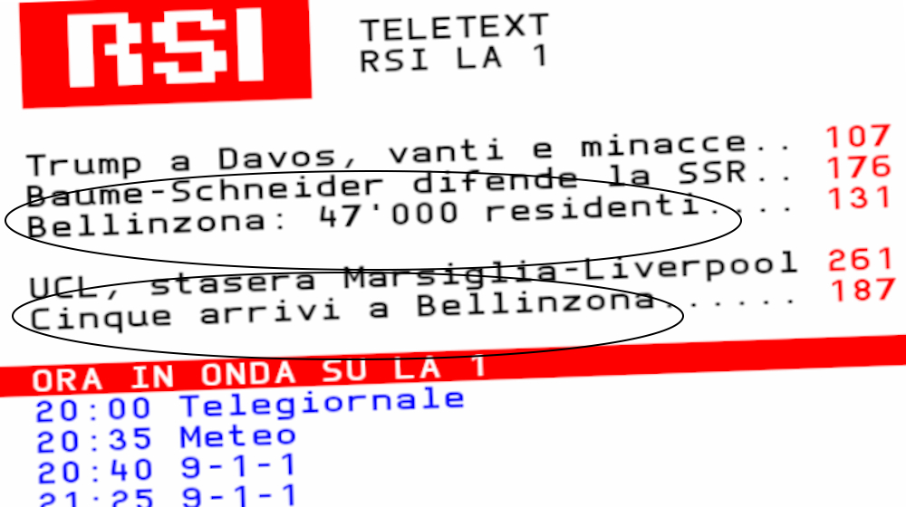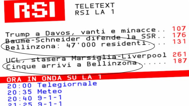 Notizia di giornata: per la settima volta consecutiva è aumentato il numero degli abitanti nel territorio della Grande Bellinzona, intesa come città capitale del Ticino dopo estensione (per aggregazione) di 13 Comuni nel 2017. Curiosa la possibile interpretazione che viene alla mente nella scorsa alla pagina principale del “Teletext” Rsi. Sopra: “Bellinzona, 47’000 residenti”; sotto, “Cinque nuovi arrivi a Bellinzona”. Eh, ma quale crescita sarebbe questa? (Fuor di battuta, e per coerenza di informazione dal momento che i cinque arrivi sono pertinenti ai neoacquisti del Bellicalcioa: alle ore 24.00 di mercoledì 31 dicembre 2025 gli abitanti erano in realtà più di 47’000, per la precisione 47’135, ed il saldo demografico positivo nell’arco dell’anno si è situato a 591 unità, che portano a 3’707 l’incremento dalla data dell’aggregazione.