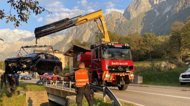 Un colpo di sonno del conducente 26enne all’origine dell’incidente stradale occorso alle ore 16.20 di ieri, giovedì 9 ottobre, lungo la Strada del Maloja in territorio comunale di Bregaglia, ed in séguito al quale tre persone – l’uomo, la fidanzata ed il figlioletto, tutti cittadini italiani – hanno dovuto far ricorso alle cure dei sanitari del nosocomio di Samedan. In frazione Stampa, lungo la direttrice di marcia verso la frazione Castasegna, i primi soccorsi prestati dall’autista di un bus; in termini di sommaria ricostruzione dell’episodio consta l’essere il veicolo uscito dalla carreggiata e, dopo attraversamento di un prato, in tuffo nell’alveo di un torrente con salto dall’altezza di circa tre metri e violento impatto. Sul posto sono giunti un medico e paramedici dal “Centro sanitario Bregaglia” in frazione Flin-Spino ed una squadra della “Rega”; le condizioni della famigliola si sono rivelate meno gravi rispetto ad una prima impressione, tanto che tutte e tre le persone coinvolte sono state dimesse già nel corso della serata. Specialisti dell’Ufficio tecnico Grigioni e dell’Ufficio cantonale caccia-pesca hanno cooperato al ripristino della zona dell’incidente. In immagine, un momento del recupero del veicolo.