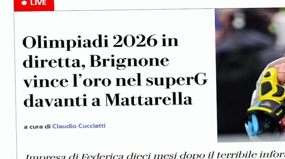 In pieno “crossover” tra due nostre rubriche (“Colpo di stiletto” ed “Italiano, quo vadis?”) si pone quanto pubblicato oggi dalla “Repubblica”, quotidiano italiano, qui sul “web”. Sensazionale è infatti l’oro olimpico appena conquistato dalla sciatrice azzurra Federica Brignone, impostasi nel Super-G a Cortina d’Ampezzo all’età di 35 anni e mezzo ed essendo rientrata solo due mesi or sono da un infortunio normalmente classificato come stroncacarriera. Ancor più clamoroso, standosi per l’appunto al titolo del giornale: al secondo posto, per rigore di graduatoria, risulterebbe essersi classificato/a tale Mattarella, che è poi l’84enne Sergio Mattarella presidente della Repubblica. Morale vecchia scuola: prima di pubblicare, fai sempre leggere ad un collega.