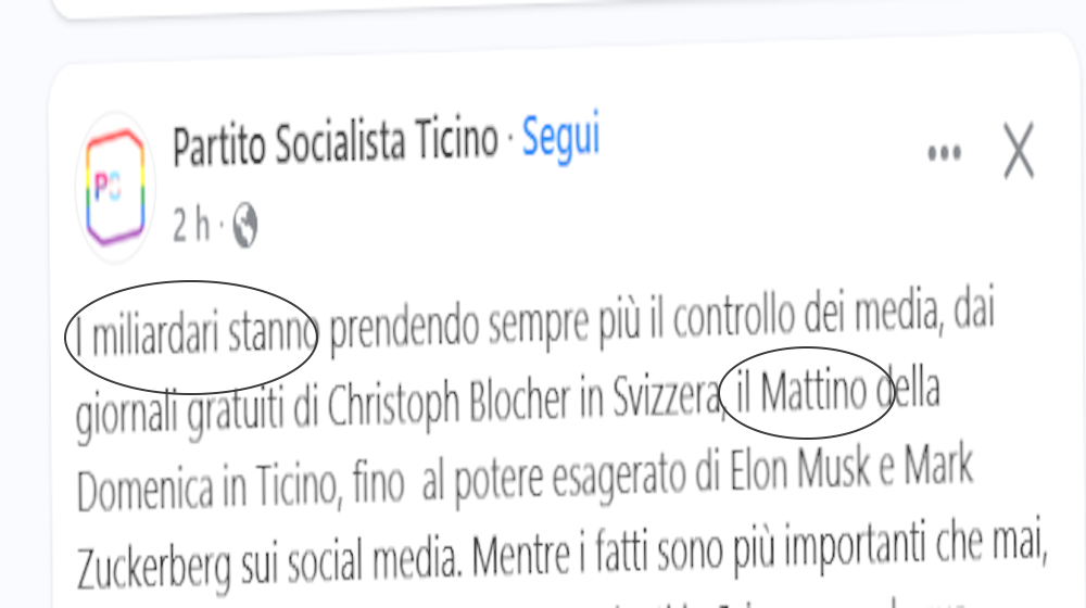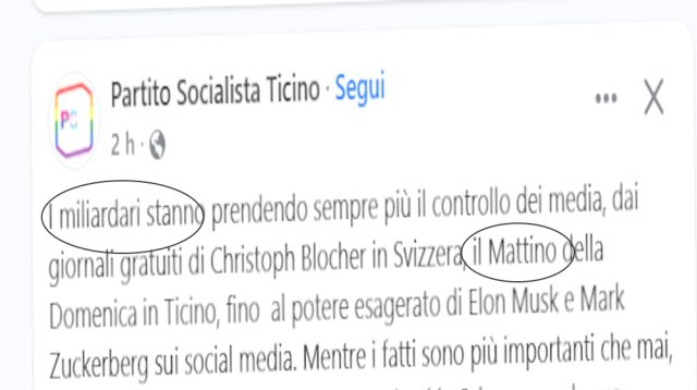 Senza tema di smentita affermasi quivi che a più d’uno, nella sempre più virulenta campagna su una certa qual iniziativa, la suola della scarpa sinistra è scivolata giù dal pedale della frizione: magari per “vis” polemica, fors’anche per roboantismo, non di rado giacché la mente su una cosa ragiona ma la mano altro scrive, a volte ancora per mostruosa ignoranza circa la materia di cui trattasi (e credeteci sulla parola, il prodotto radiotelevisivo è un gran casino). Andiede lungo stamane, di sicuro per mero eccesso di agglutinazione dei concetti, il responsabile dei “media” sociali di casa Ps Ticino: tra i “miliardari (che) stanno prendendo sempre più il controllo” dei mezzi di comunicazione, insieme con Elon Musk e Mark Zuckerberg, è citato il… “Mattino della domenica”. Per carità, presenza editoriale – e senza cesure – da 36 anni a questa parte; ma suvvia, compagni, i miliardari sono altra cosa. Post scriptum: il “post” anti-Mark Zuckerberg è stato pubblicato su “Facebook”, piattaforma acquisita dalla “Meta incorporated”, proprietario Mark Zuckerberg; se questo non è un cortocircuito della logica…