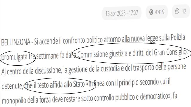 Da solitamente attendibile fonte di stampa territoriale abbiamo appreso, nelle scorse ore, che da tre settimane a questa parte sarebbe in vigore la nuova Legge sulla polizia e che a dare il “via libera” al testo sarebbero stati direttamente i membri della Commissione granconsiliare giustizia-diritti. La cosa ha un nonsoché di allarmante: a noi risultavano in corso i lavori di revisione della Legge sulla polizia e non già rata ed in essere una nuova legge “tout court”; a noi risultava inoltre che l’approvazione dipendesse non da una commissione ma ancora dal Legislativo in quanto tale, sussistendo incidentalmente un diritto al dibattito parlamentare prima della citata “promulgazione”. O che il pezzo fosse previsto per il Primo aprile?