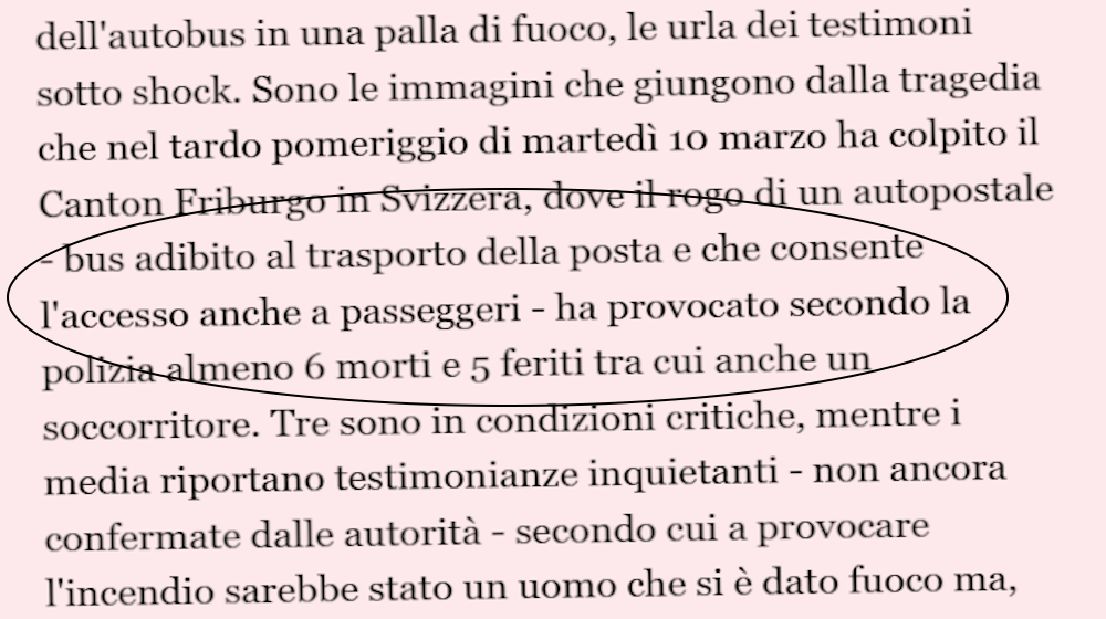 Nel Canton Friborgo, un dramma circa il quale è da evitarsi ogni genere di speculazioni, almeno sino ad avvenuto accertamento della dinamica e di quel che avrebbe indotto un uomo a darsi fuoco ed a scatenare l’inferno a bordo di un bus extraurbano. Dal momento che la notizia è stata ripresa all’estero (giusto: si chiama impegno – se non dovere – di cronaca) ed in Italia ampliata a dismisura (effetto “eco Crans-Montana”: tutto ciò che è sciagura in Svizzera ha da essere reso ridondante), ai colleghi che della Confederazione elvetica scrivono senza saper trovare Zurigo o Berna sulla cartina geografia sommessamente diciamo che continuano a scopiazzare – e male – da fonti non attendibili. Di che dubitarsi, ad esempio, circa l’essersi manifestata in tale rogo una “palla di fuoco”, fenomeno fisicamente improbabile in ambiente non chiuso. Circa la tipologia e le funzioni del veicolo, in immagine il pubblicato da una testata tricolore (e non è l’unica) ad ampia diffusione.