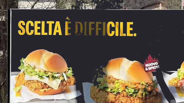 Cartelloni pubblicitari in ogni dove sul territorio ticinese, e soprattutto lungo le primarie arterie stradali, a pubblicizzare le novità in celebre catena del “fast food”. Investimento economico significativo, si suppone; meglio sarebbe stato tuttavia l’indirizzare parte del “budget” sulla traduzione del messaggio; sarebbe bastato, per dire, l’acquisto di un articolo determinativo (“la” prima di “scelta”), o l’eliminazione del predicato verbale (“Scelta difficile”, niente “è”), o l’utilizzo del verbo all’infinito (“scegliere”) in luogo del sostantivo (“scelta”). In nome della superficialità nella traduzione dall’inglese, per contro, sacrificato quel che è logico e grammaticalmente giusto. A farla breve: scelta sì, ma sbagliata. Anzi: difficile il far di peggio…
