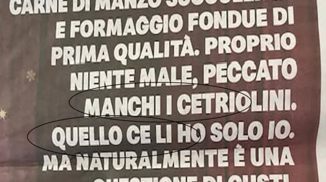 Fastidioso ma ci sta, come sa chi abbia pratica del mestieraccio, è l’errore tipografico da svista o da dita incrociatesi nello scrivere o nel trascrivere. Irrita, per contro, l’errore tipografico da sciatteria, quello cioè da qualcuno commesso e che finisce magari in un titolo o in un inserto pubblicitario: da sciatteria perché si suppone che tale testo, prima di andare alle stampe, sia sottoposto a verifica ed a controllo di almeno altri due occhi oltre a quelli dell’estensore, e ciò per naturale diligenza oltre che per evitare di far brutte figure. Come la mettiamo, allora, con questa “prima” pubblicitaria di nota testata morente? Lasciamo da parte la banalità del testo; sino a prova del contrario, e non si può evitare di notarlo, i cetriolini sono al plurale e richiedono un verbo concordato al plurale; sicuramente al plurale va poi anche il pronome dimostrativo (“quelli” in luogo di “quello”). La campagna promozionale sarà costata qualche migliaio di franchi; pagarne 20 ad un traduttore di lingua madre, almeno per la revisione, no, ver