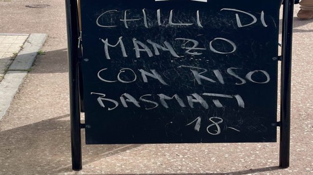 18 franchi per un piatto unico con riso di qualità e carne, con certe cifre che girano e per di più parlandosi di un ristorante a Lugano, formano prezzo più che accettabile. Anche perché, così scritto, il messaggio (gesso-su-ardesia, autore ignoto, secolo XXI) della lavagna da cavalletto all’esterno del locale medesimo indica non già che trattasi di una proposta “tex-mex”, ma di un sostanziale… “All you can eat” a base di manzo, del quale si potrebbero ordinare chili su chili e sempre con il mero esborso di quei 18 franchi. Suggerimento: riformulare il testo, basta uno sforzino (thx al delatore Effegì, notissimo enigmista).