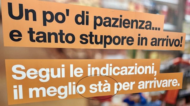Di un certo spessore l’annuncio sulla vetrofania: in corso di esecuzione il rinnovamento degli ambienti in cui trovavasi e si troverà un punto-vendita di una nota catena della grande distribuzione organizzata. Di sicuro impatto il messaggio: il verbo “stare”, coniugato alla terza persona dell’indicativo presente, con un accento brutalmente e proditoriamente piazzato sulla lettera “A”. Insieme con i milioni di franchi investiti per la ristrutturazione, magari trovare 20 centesimi per pagare un traduttore, o almeno uno che conosca la lingua del luogo e sia stato promosso in seconda elementare?