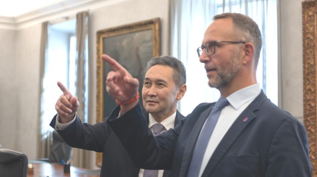 Confronto su temi di comune interesse, dall’economia alla cultura, durante la visita di cortesia che Kairat Sarzhanov, ambasciatore del Kazakistan accreditato a Berna, ha effettuato venerdì a Palazzo delle Orsoline in Bellinzona, ospite del Governo cantonale e per esso accolto da Norman Gobbi presidente dell’Esecutivo medesimo. Il 58enne diplomatico della Repubblica già parte dell’Unione Sovietica, figura peraltro non al primo contatto con le istituzioni ticinesi (in aprile l’incontro a Lugano con i vertici della “Camera di commercio”, sugli sviluppi tra l’altro di un abboccamento avuto in gennaio a Berna), era accompagnato da Adil Makeyev, terzo segretario dell’ambasciata. In immagine ufficiale dai Servizi della Cancelleria cantonale, Kairat Sarzhanov con Norman Gobbi.
