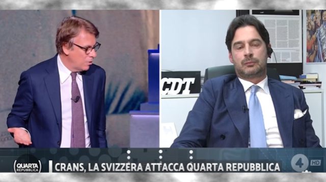 Finiamola qui, benché sul difendere la Svizzera dall’ostentato raccapriccio altrui la domanda di fondo resti, in reiterazione dunque – semmai, con lieve modifica – di quanto qui già scritto giorni addietro: perché c’è voluto un Paride Pelli per rimettere il campanile al centro del villaggio, e si spera (ma non ci crediamo) che le sue parole siano destinate a propagarsi da trasmissione a trasmissione? Dove sono gli altri che da qui, con almeno pari solidità nelle argomentazioni e poi secondo estro proprio e con linguaggio commisurato al proprio ruolo, avrebbero dovuto stroncare sul nascere gli errori di interpretazione, le dicerie e le generalizzazioni buone per un titolo effimero e per il “Kaffeeklatsch” sempiterno? Nell’immagine, a sinistra Nicola Porro conduttore di “Quarta Repubblica”, a destra Paride Pelli.