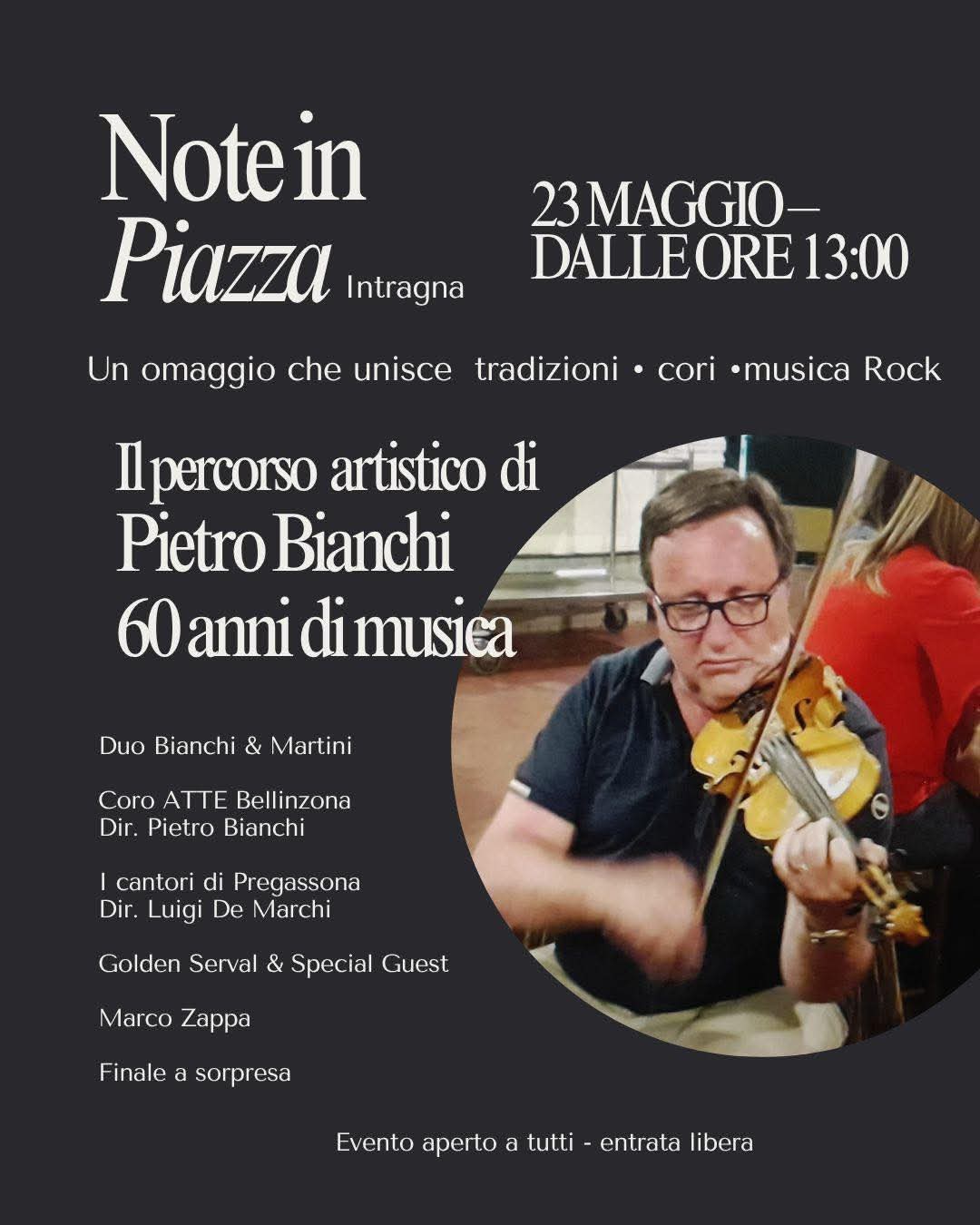 Am Samstag, den 23. Mai 2026, verwandelt sich die Piazza d’Intragna ab 13:00 Uhr in eine große Bühne für alle Musikliebhaber! Das Dorf ehrt einen seiner ganz Besonderen Musiker: Pietro Bianchi, Dirigent, Legende. 60 Jahre auf der Bühne – das wird gebührend gefeiert! Auf dem Programm steht ein bunter Mix, der keine Wünsche offenlässt: Duo Bianchi & Martini, Coro ATTE Bellinzona, Dir. Pietro Bianchi, I cantori di Pregassona, Dir. Luigi De Marchi, Golden Serval & Special Guest: Marco Zappa … und ein **Finale a sorpresa** – was das wohl sein wird?Von Tradition über Chor bis Rock – für jeden Geschmack ist etwas dabei! Eintritt frei – die Veranstaltung ist für alle offen!