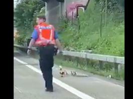 Pratteln (Kanton Basel-Landschaft): Entenfamilie auf der Autobahn A2 eskortiert