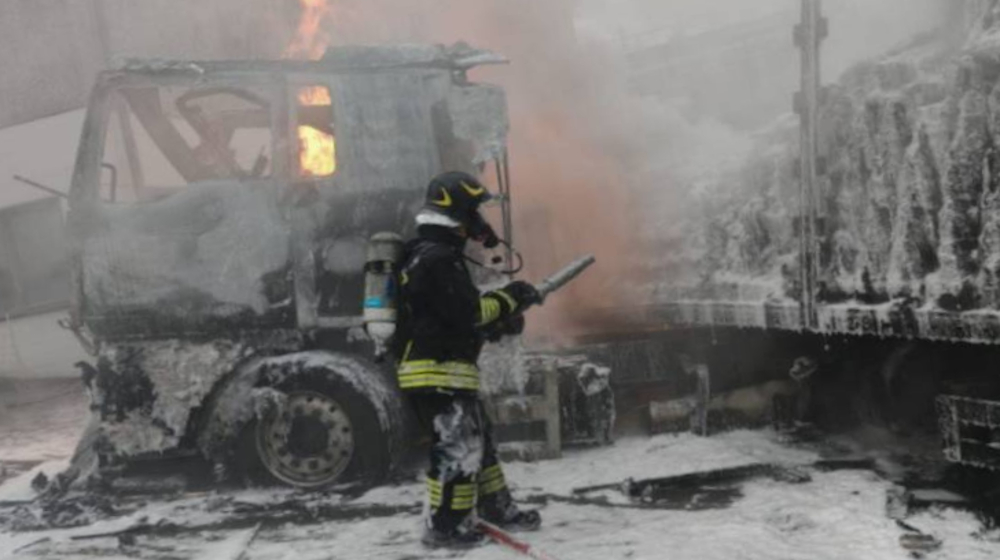 (ULTIMO AGGIORNAMENTO, ORE 20.39) Si è risolto senza conseguenze per le persone, ma con significativi danni materiali per la cui valutazione saranno necessari giorni e non potendosi escludere conseguenze ambientali per aria, acqua e suolo, l’incendio di un autoarticolato esploso sul mezzogiorno di oggi dopo aver colliso con una cabina della distribuzione di gas metano nella zona sud del territorio comunale di Varese, lungo via Per Schianno. Come da accertata ricostruzione, il veicolo carico di bobine di materiale plastico era in fase di manovra; nel volgere di pochi secondi l’urto, il boato e le fiamme da cui mezzo, merce trasportata e manufatti sono stati rapidamente ingoiati. Il conducente del camion è riuscito a mettersi in salvo. Impressionante il rogo, massiccio il dispiegamento di unità a soccorso: sei mezzi dei Vigili del fuoco dal Comando provinciale nel capoluogo, squadre dai comprovinciali Distaccamenti di Laveno Mombello e di Tradate, presenti pattuglie della Polizia locale. Le operazioni di spegnimento dell’incendio si sono protratte sino alla prima serata. Nella foto, la scena dell’incidente; altre immagini sulla nostra pagina “Facebook”.