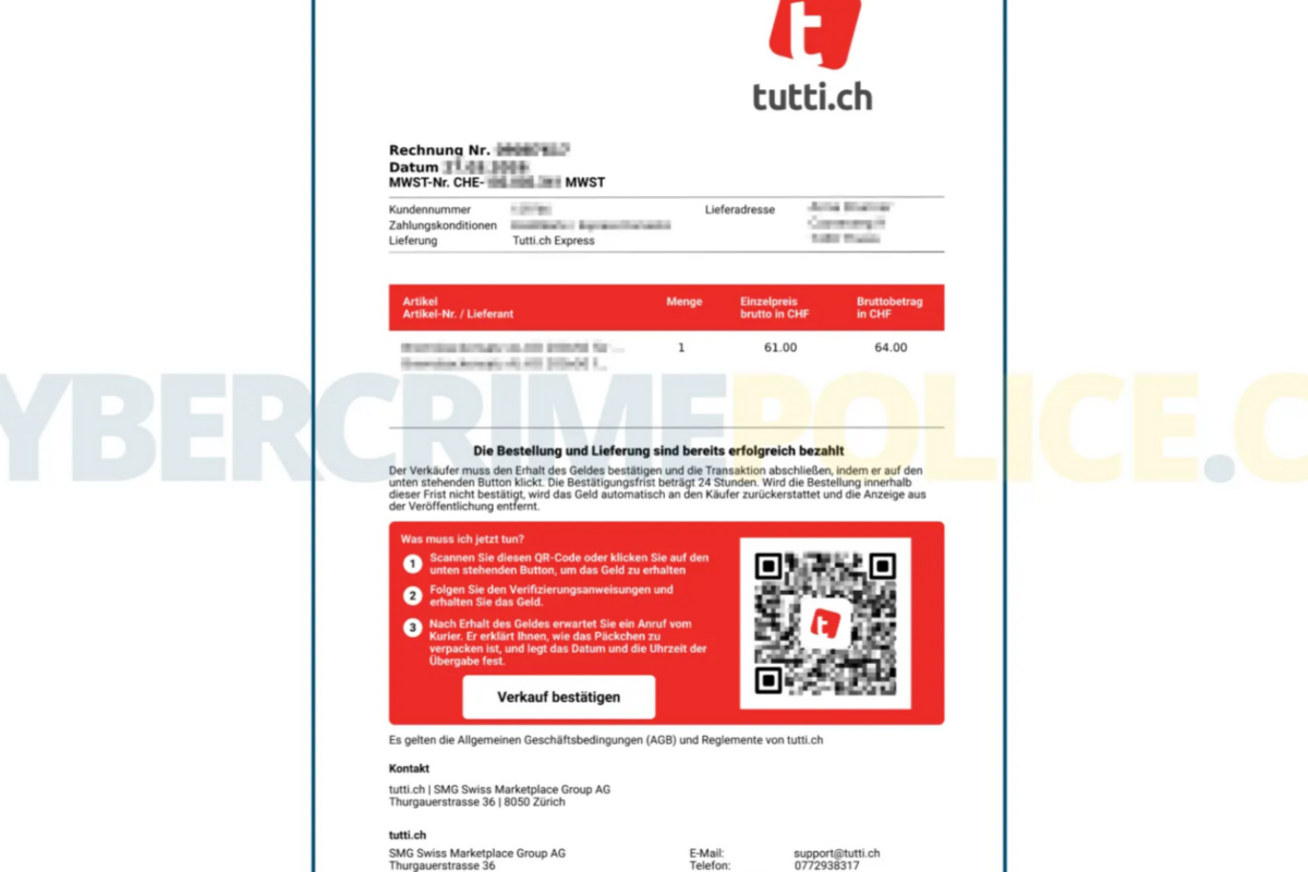 Du verkaufst etwas auf tutti.ch? Dann aufgepasst: Betrüger melden sich als angebliche Kaufinteressenten und schicken dir eine gefälschte Rechnung – scheinbar von tutti.ch, komplett mit offiziellem Logo, Firbengebung und QR-Code. Eine zweite E-Mail bestätigt dann die angeblich bereits erfolgte Zahlung. Alles wirkt täuschend echt. Doch es ist eine Falle!